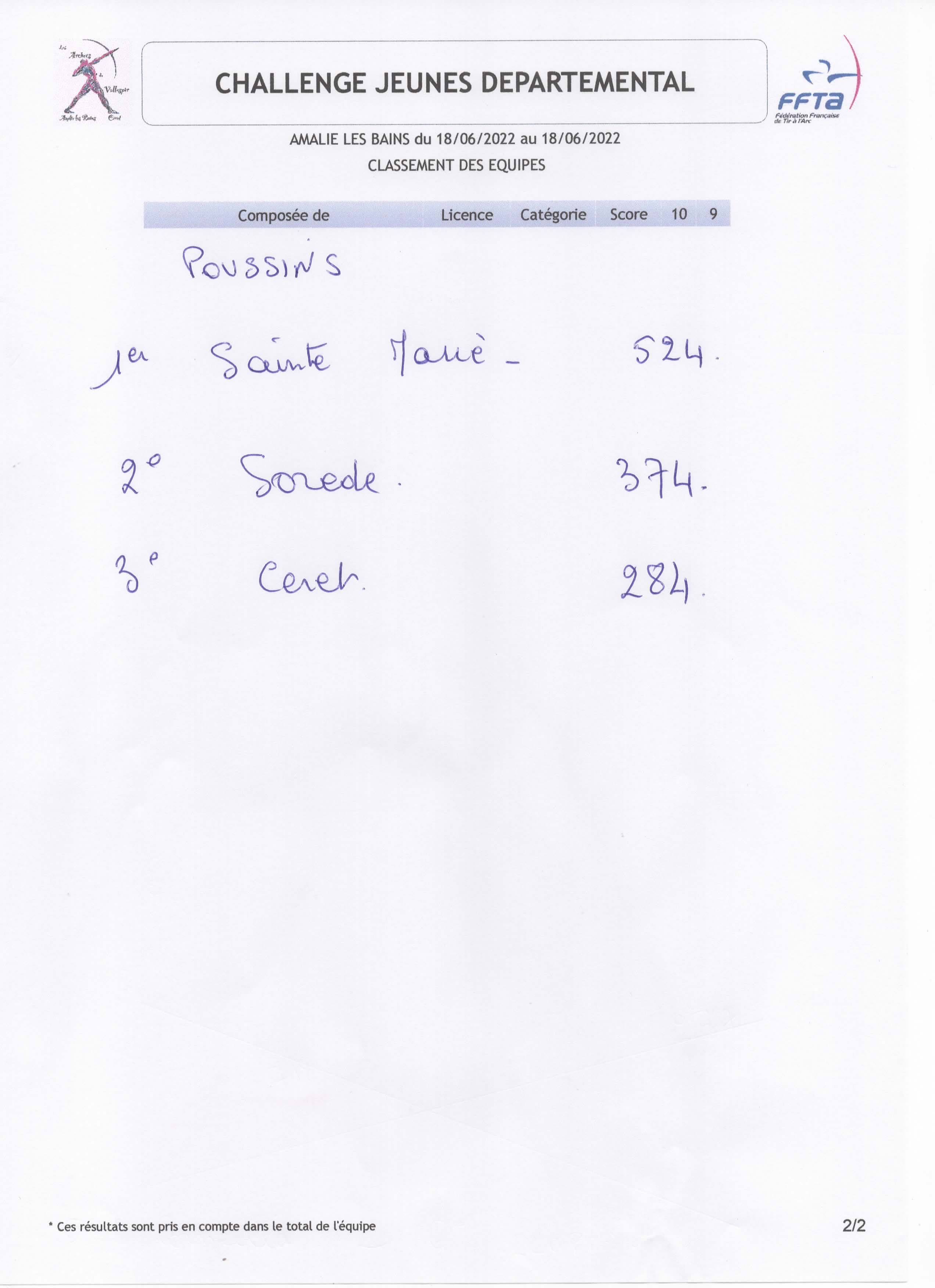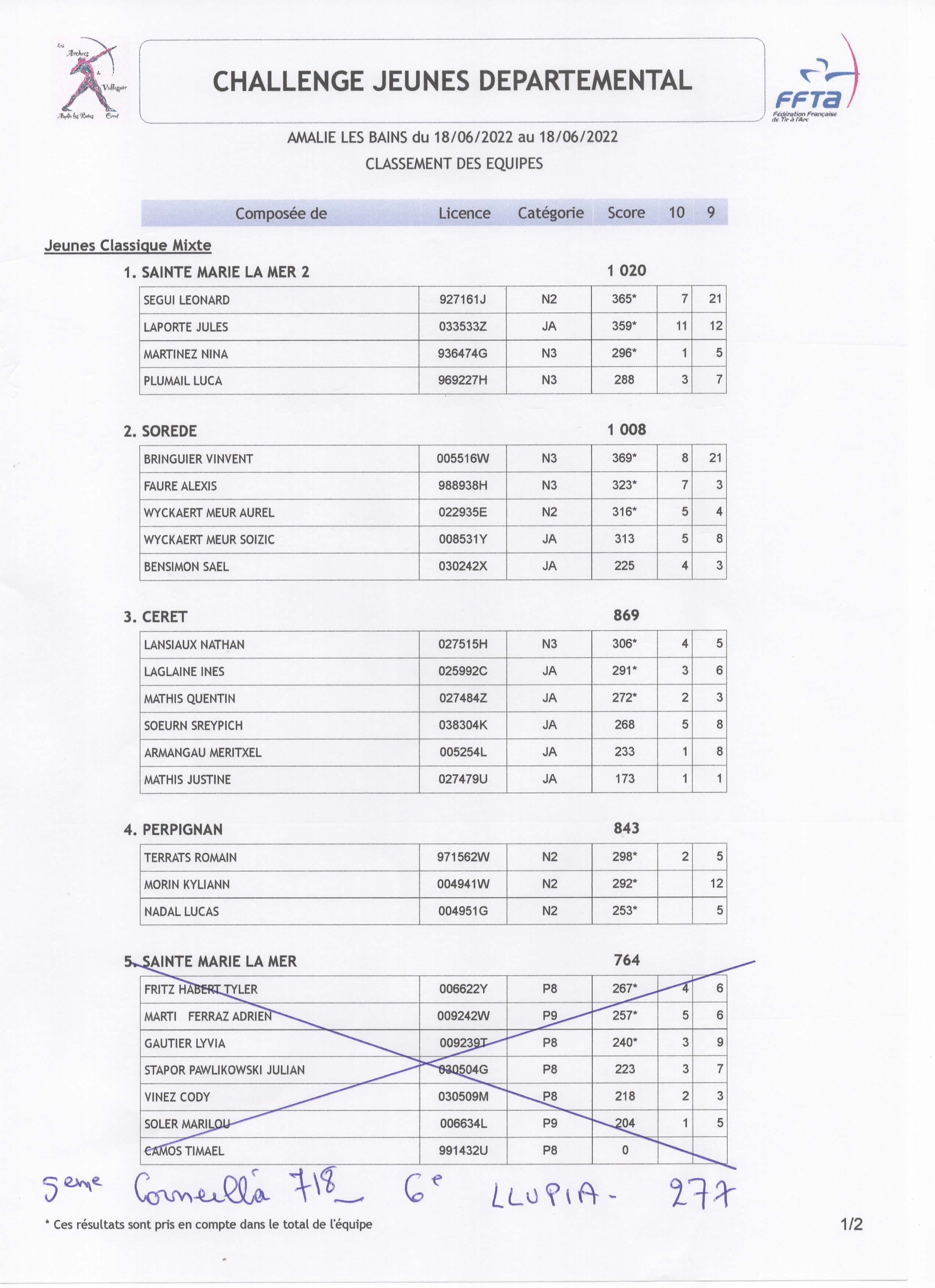 résultats championnat départemental jeunes par équipe Llupia 25/6/22